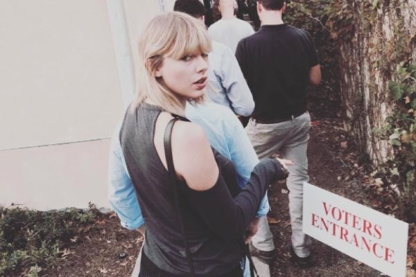 Penyanyi Taylor Swift mengunggah fotonya yang terlihat sedang mengantri menuju bilik suara. Dia kemudian menuliskan "Hari ini adalah waktunya. Keluar dan berikan suara".